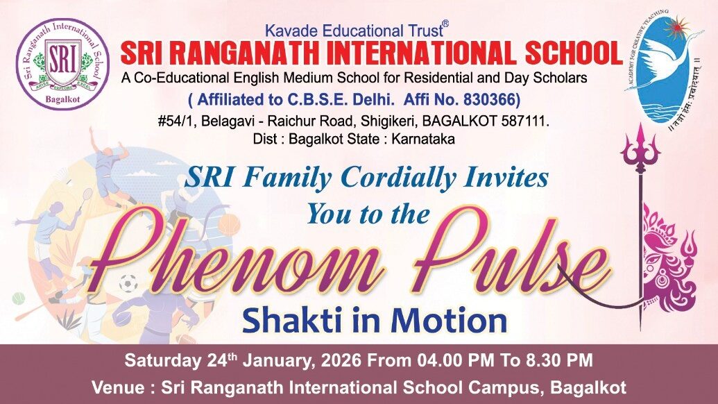 Football Team Winners @ SRI Bijapur Football Tournaments Kannada Rajyotsava Celebrations "Kargil Vijay Diwas was celebrated in the esteemed presence of Chief Guest Mr. Subedar Vinayak Narvekar." "Kargil Vijay Diwas was celebrated in the esteemed presence of Chief Guest Mr. Subedar Vinayak Narvekar." Welcomed New SP of Bagalkot, Mr. Siddharth Goyal, on behalf of SRI Management, Principal, Vice Principal, Students and all stakeholders. International Yoga Day Welcoming Newly appointed Bagalkot DC FOUNDER'S DAY Reopening Of The School Graduation Day Euphoria . World Environment Day World Environment Day -2025 FOOTBALL MATCH CBSE Capacity Building Programme(CBP) Bengaluru Session on Active Learning at SRI Ranganath International School. Children's Day Celebration Children's Day Celebration Teachers Day Celebration Training Social Science Activity Independence Day Librarian Day CBSE SAFAL PILOT SCHOOL CBSE SAFAL PILOT SCHOOL FOR 2023-24 and 2024-25 PILOT SCHOOL FOR CBSE HYBRID PROJECT. CBSE Pilot Project Hybrid Learning School. IN MEDIA